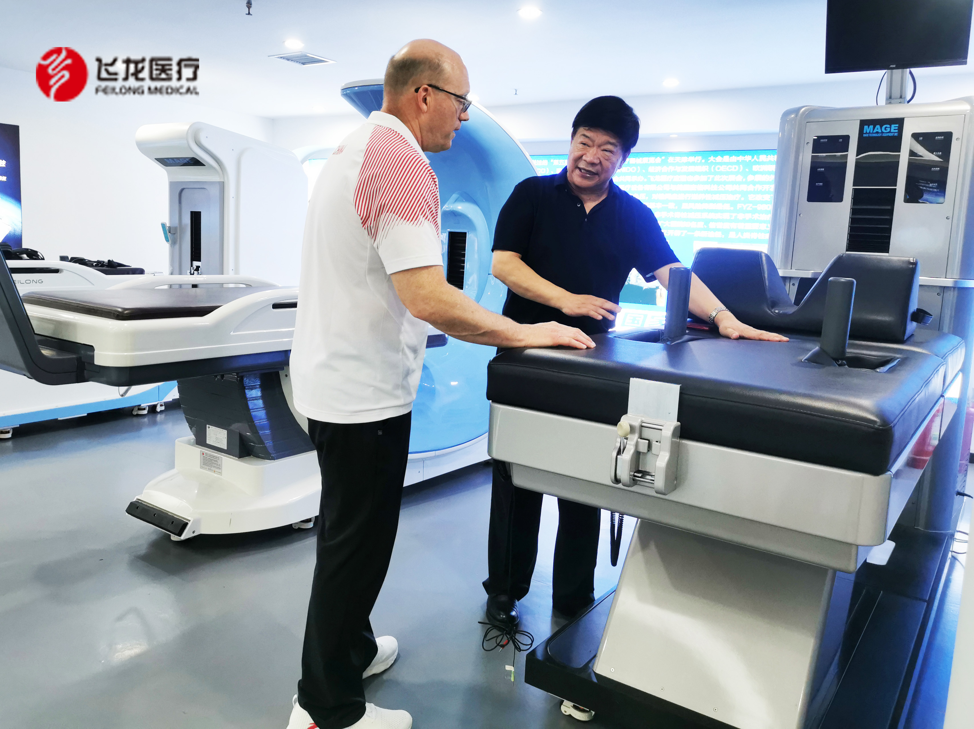 開班儀式中,清華大學(xué)——生命大學(xué)脊骨神經(jīng)醫(yī)學(xué)研究中心、清華大學(xué)高級(jí)訪問學(xué)者、美國(guó)著名的脊骨神經(jīng)醫(yī)學(xué)專家David Bellin教授對(duì)飛龍醫(yī)療外星艙系列產(chǎn)品非常感興趣,并在會(huì)議后主動(dòng)提出實(shí)地參觀飛龍醫(yī)療外星艙系列產(chǎn)品。