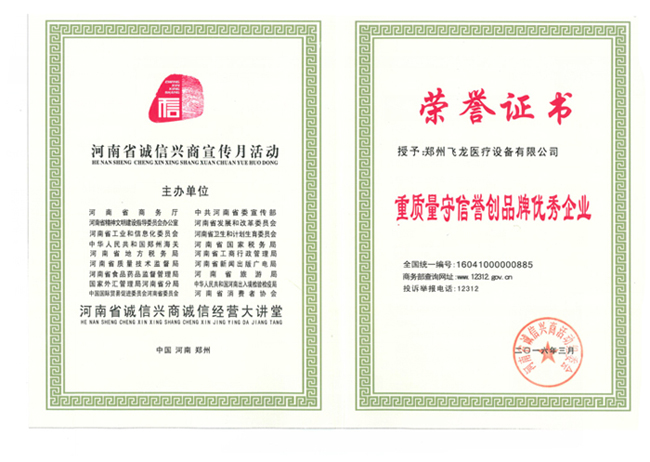 鄭州飛龍醫(yī)療設(shè)備有限公司獲得榮譽(yù)證書