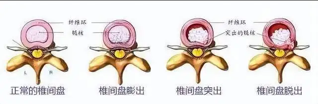 腰椎間盤脫出是指纖維環(huán)完全撕裂破口,內(nèi)部的髓核從這個破口脫出到椎管內(nèi);